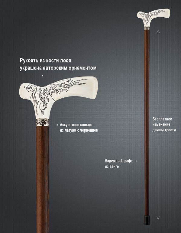 Изготовление трости начинается с учета размеров вашей ладони, роста и веса, чтобы обеспечить максимально комфортное использование. Материал рукояти выполнен из прочной кости лося и украшен авторским орнаментом, добавляющим шарма и элегантности. Белая трость станет прекрасным аксессуаром, который привлечет внимание и позволит вам выделиться из толпы.