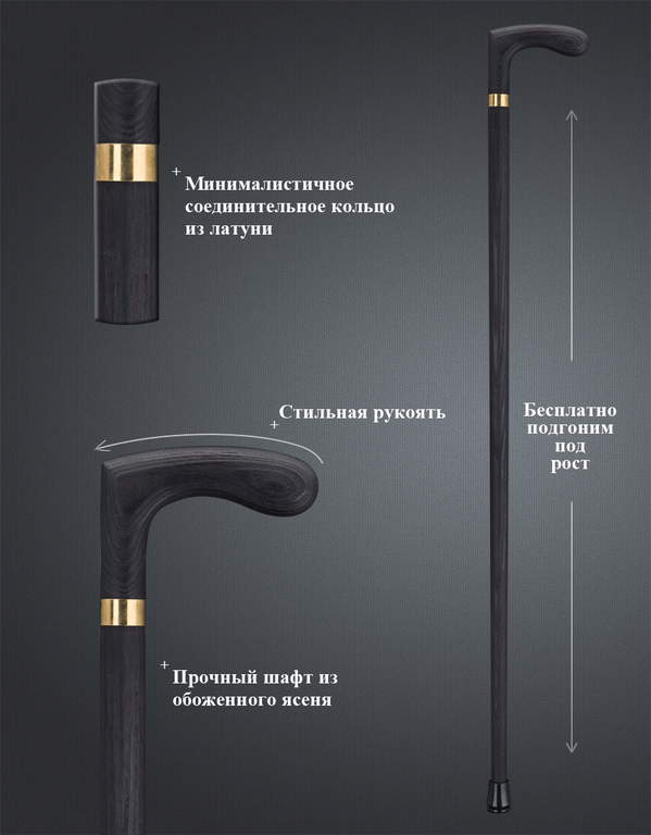 Основной материал трости - массив обожженного ясеня. Такой выбор материала обусловлен его прочностью, долговечностью и эстетическим видом. Обожжённый ясень обладает особенным темным оттенком, который придает тростям изысканность и шарм.