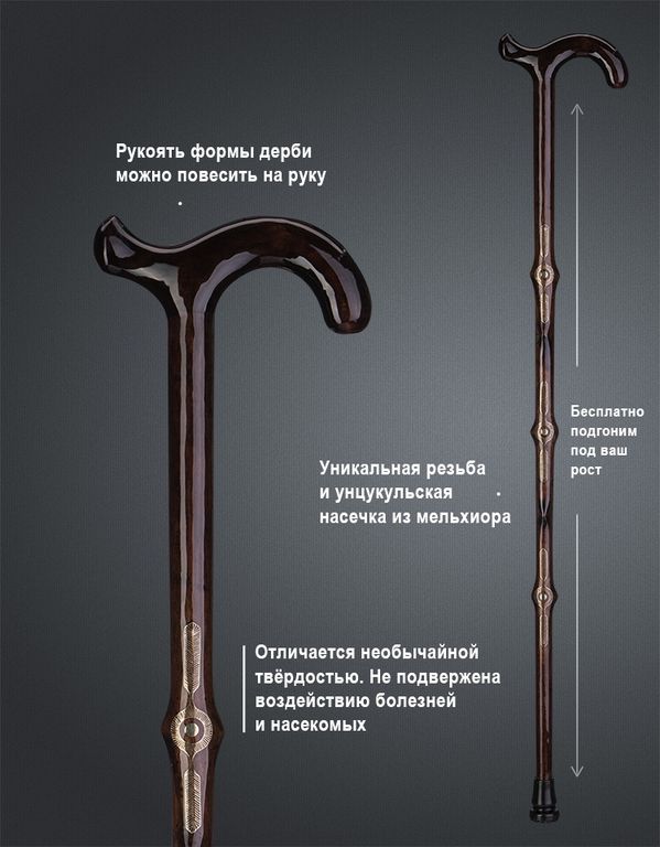 Шафт каждой трости украшен унцукульской насечкой из мельхиора и резьбой, что придает ей элегантный вид. Унцукульская насечка является традиционным узором, который применяется при создании тростей ручной работы. Резьба на шафте добавляет трости изюминку и делает ее по-настоящему уникальной.