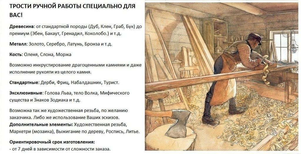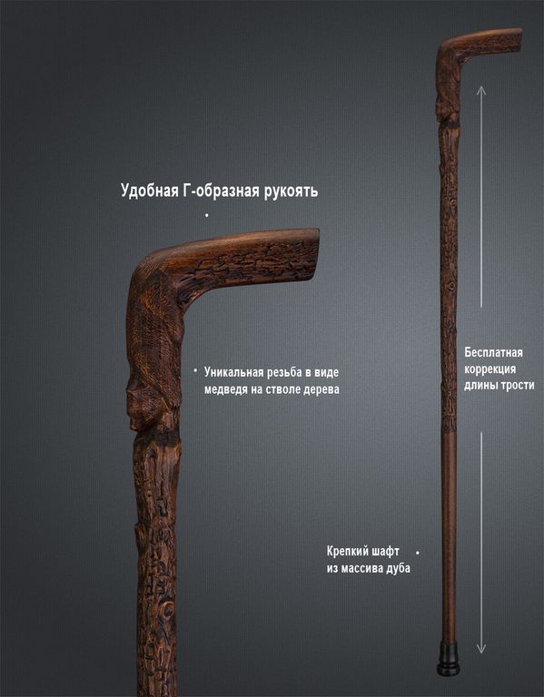 Приобретая нашу трость резную, Вы получаете не только качественный и стильный аксессуар, но и частичку уникальности и эксклюзивности. Мы гарантируем качество изготовления и долговечность нашей продукции. Будьте уверены, что Ваша трость будет служить верой и правдой в течение многих лет. Украсьте свою жизнь и повседневность с помощью наших тростей ручной работы