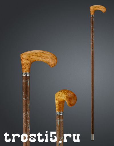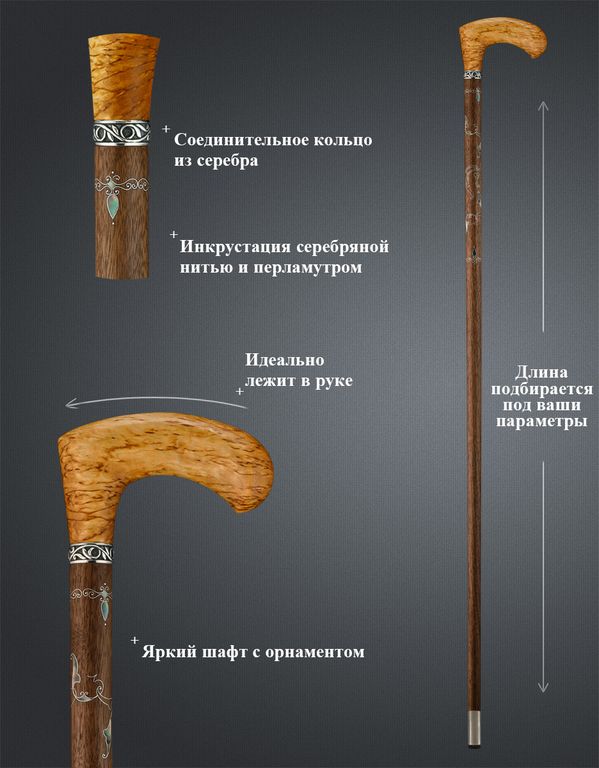 Трость исполнена из премиальной породы древесины и представляет собой произведение искусства! Узор серебряной нитью с перламутровыми вставками, которые в народе называют "Мать Жемчуга"