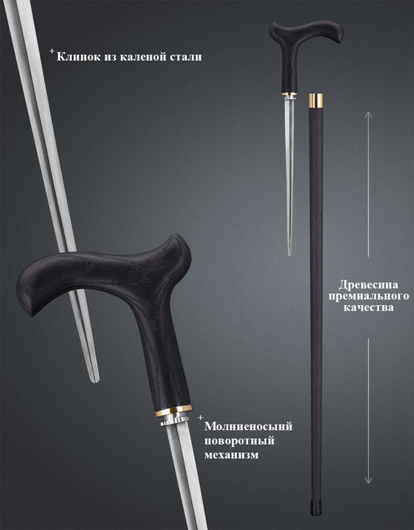 Трость оснащена поворотным механизмом из латуни, напоминающим пример пожарного гидранта. Это соединительное кольцо обеспечивает надежное крепление трости и позволяет удобно использовать ее в повседневной жизни. Клинок трости выполнен из каленой стали 65Г и имеет ромбовидную форму. Хотя у него нет колюще-режущих кромок, он все равно может служить не только как элемент декора, но и как функциональный инструмент.