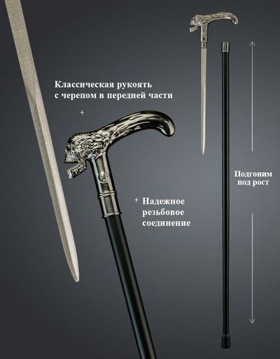 Главная особенность трости — съемный клинок из углеродистой стали (общая длина с рукоятью ~42 см) с безопасным скругленным кончиком, что выводит изделие из категории холодного оружия. Максимальная длина трости — 92-93 см с возможностью подгонки под ваш рост.