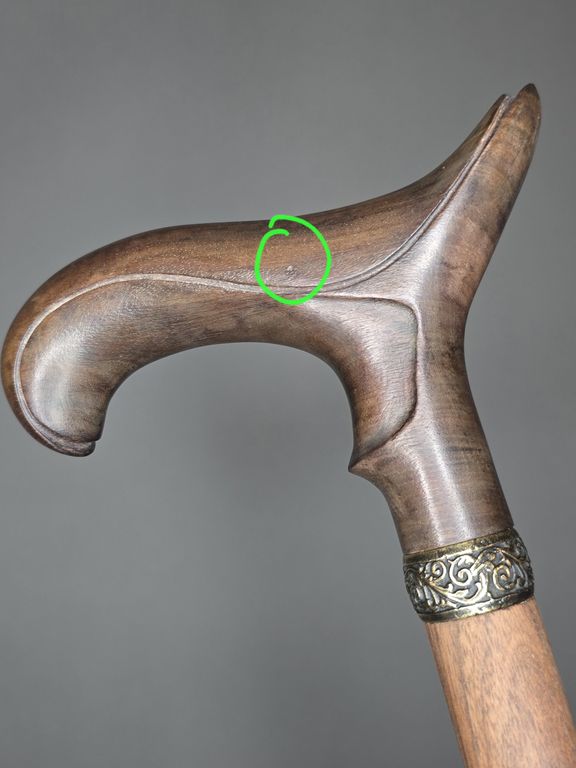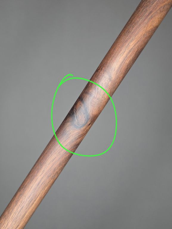 Наличие полосок фактуры, которые некоторым клиентам кажутся трещинами, на самом деле это прожилки африканского ореха, их не удалось отшлифовать, так как они проходят наскволь через весь брусок. Это тоже не влияет на прочность трости.