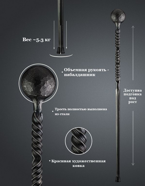 Продемонстрируй всем свою силу и мощь с эксклюзивной тростью весом под 5кг! Трость ручной работы, созданная мастером-кузнецом.