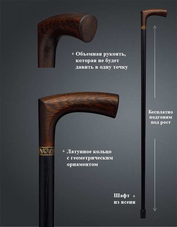 Материал, из которого изготавливается трость, играет важную роль в ее прочности и эстетическом виде. Наша трость изготовлена из кавказского дуба - прочного и надежного дерева. Каждая деталь трости обрабатывается мастером с особой тщательностью, чтобы достичь идеальной гладкости и текстуры. Это делает трость не только прочной, но и приятной на ощупь.