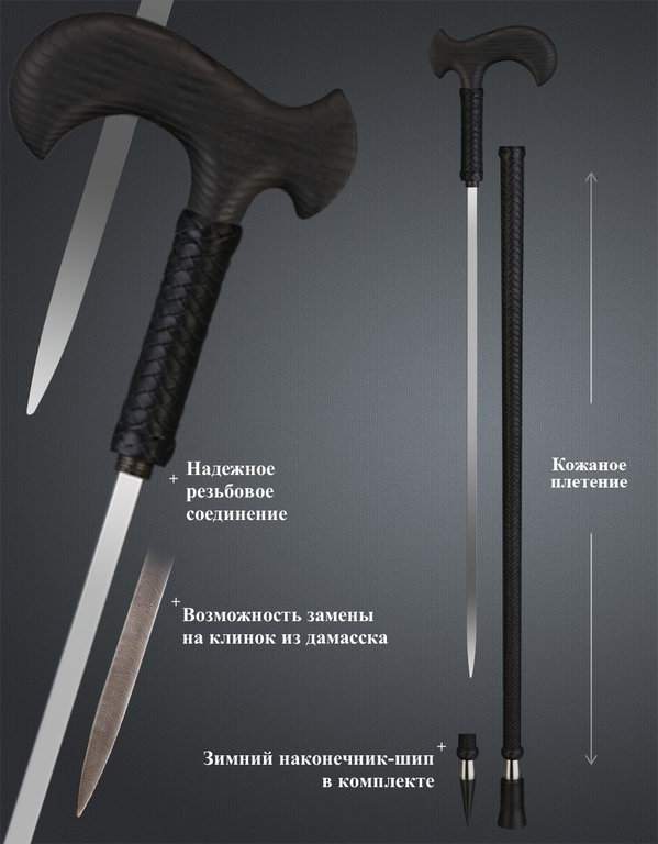 Неповторимая трость ручной работы с клинком и съемными наконечниками станет надежным спутником в любой ситуации.