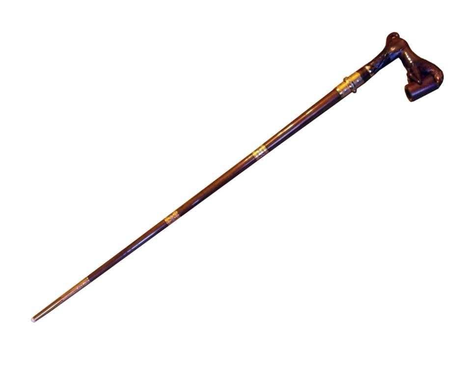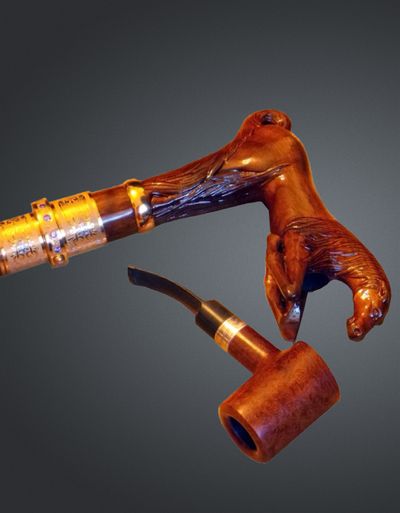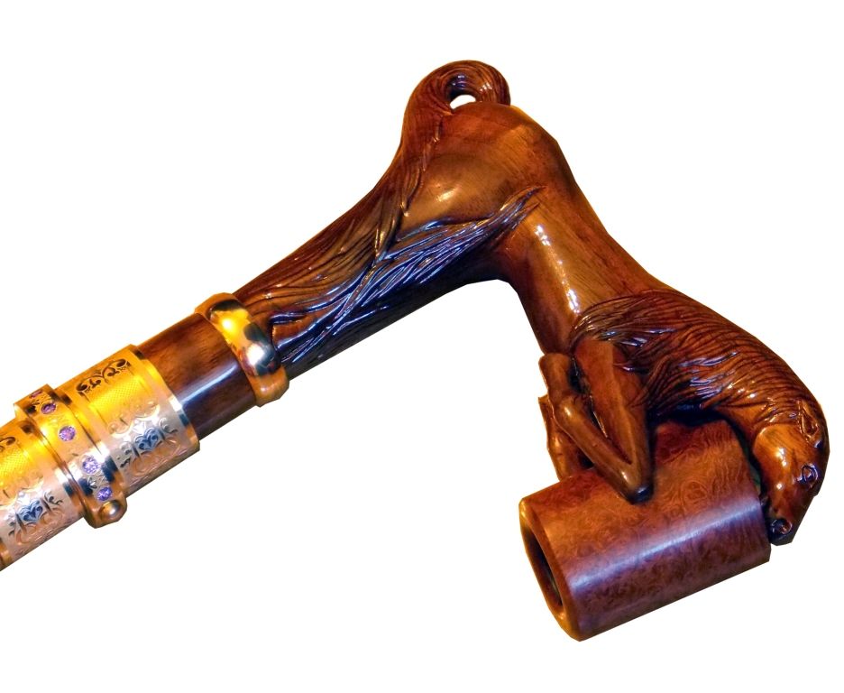 Рукоять: в форме коня в прыжке. Оснащена съемной курительной трубкой.