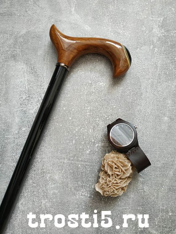 Коричневый цвет рукояти великолепно сочетается с черным цветом лакированного шафта. Шафт выполнен из бука и покрыт несколькими слоями лака, что придает ему необыкновенный глянец и защищает от повреждений. Это делает трость не только элегантной, но и устойчивой к внешним воздействиям.