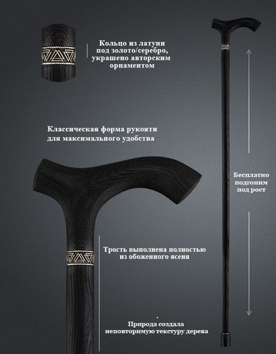 Эта трость для тех, кому нужна не просто опора, а статусный аксессуар с историей. Удобная классическая рукоять снижает нагрузку на суставы, а латунное кольцо с уникальным орнаментом (на выбор: золото или серебро) делает модель узнаваемой.