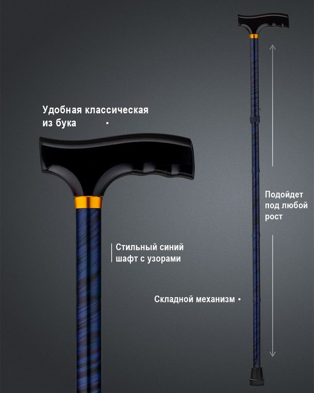 Одной из главных особенностей нашей трости является ее складная конструкция. Благодаря этому, вы можете легко и компактно переносить ее в сложенном состоянии, что особенно удобно при путешествиях. Минимальная длина в сложенном состоянии всего 30 см, что позволяет взять трость с собой в любую поездку или просто хранить ее дома или в сумке.