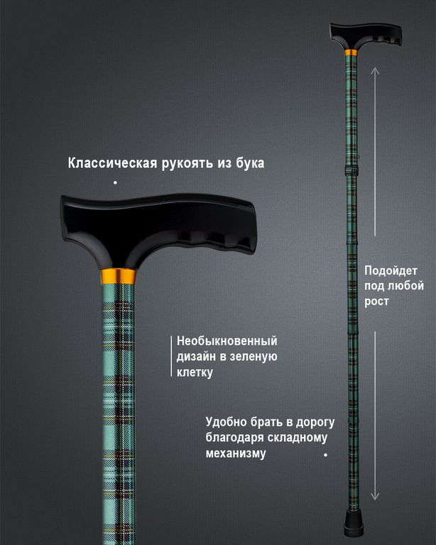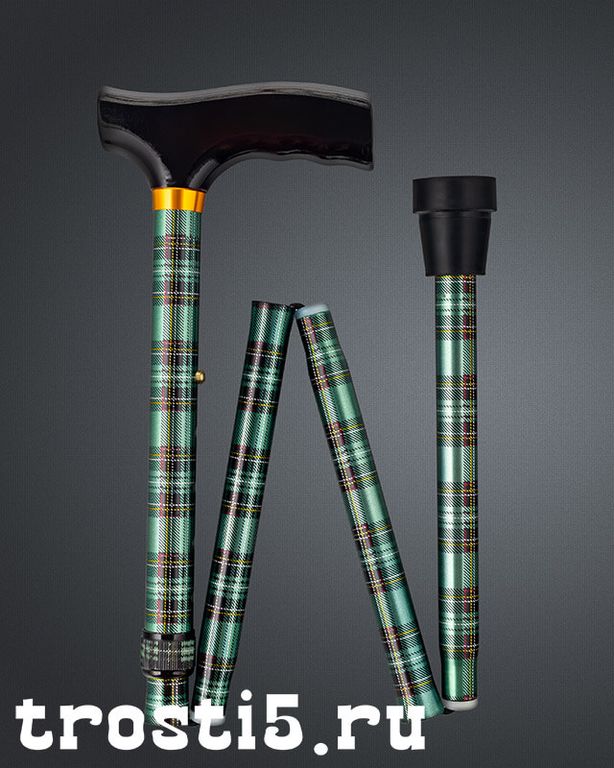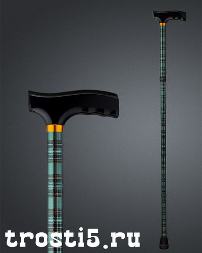 Основной материал, используемый в изготовлении шафта трости - авиационный алюминий. Он обладает высокой прочностью и легкостью, что делает трость удобной для переноски и использования в повседневной жизни. Цвет рукояти - черный с легким бордовым оттенком, а цвет шафта - зеленый в клетку. Это придает тростям стильный и модный вид.