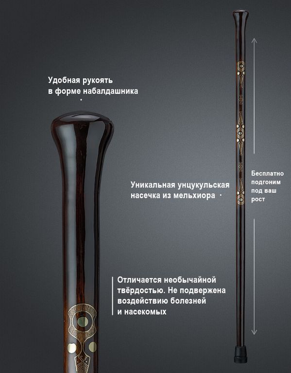 Трость тонкой ручной работы - элегантное произведение искусства мастера. Удобная и проработанная трость с рукоятью в форме набалдашника, эффектным и оригинальным шафтом, с необычной инкрустацией.