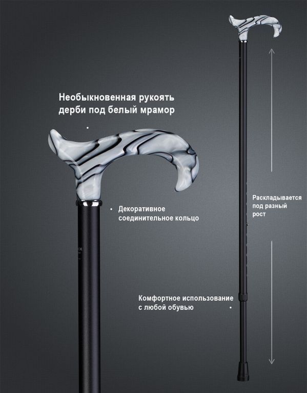 Однако, вне зависимости от надежности и функциональности трости, она также является объектом вашего стиля. Поэтому мы предлагаем вам трость с красивым мраморным дизайном. Она придаст вашему образу изюминку и подчеркнет вашу индивидуальность. Окунитесь в мир элегантности и выразительности с нашей женской тростью.