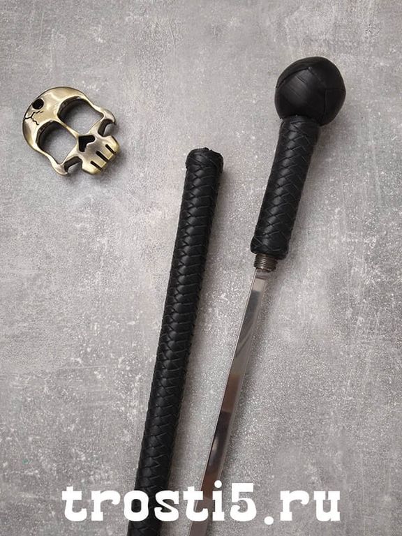 Оформление шафта выполнено в виде кожаного плетения, что добавляет изысканности и элегантности данной модели. Цвет кожи - черный, что делает трость более стильной и привлекательной. Наконечник трости может быть резиновым или с шипом, в зависимости от ваших предпочтений.