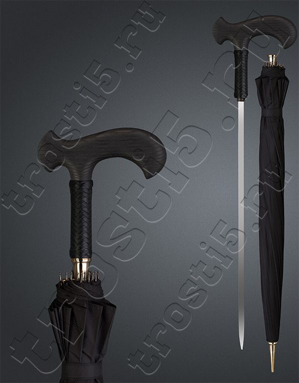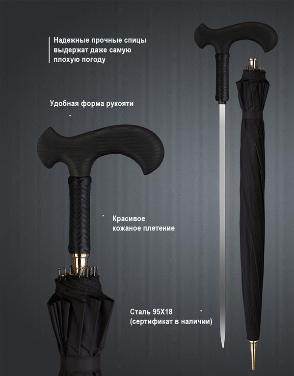 - Клинок: сталь 95Х18, 49 см. У зонта-трости есть специальный клинок, который может быть использован в качестве самообороны. Клинок выполнен из прочной стали и имеет сертификат качества.