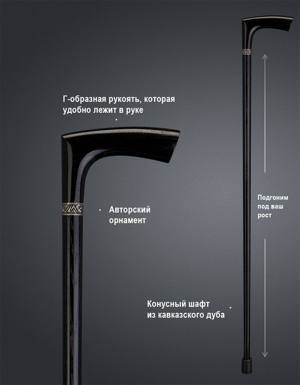 Изготовлена трость из кавказского дуба - это натуральный и прочный материал, который обладает высокой стойкостью к механическим воздействиям. Такая трость будет служить долгое время и не потеряет своего первоначального вида.