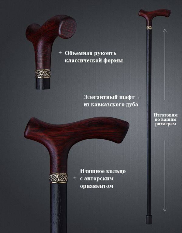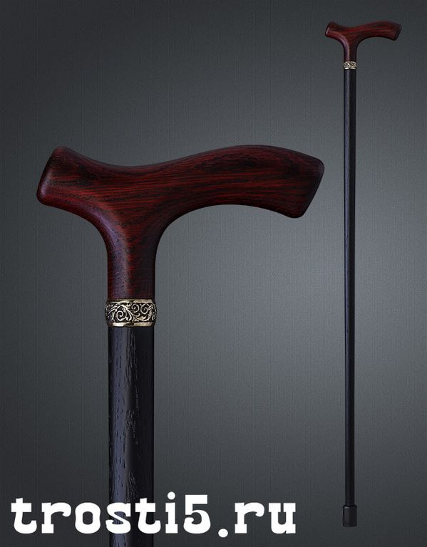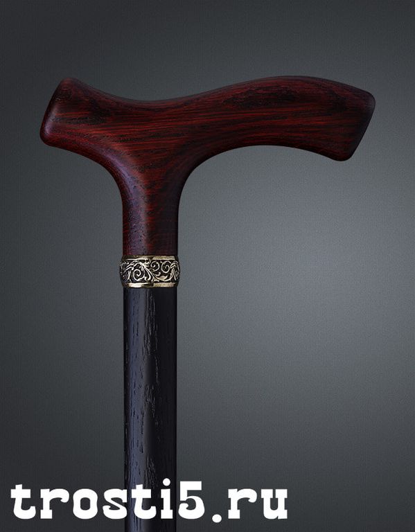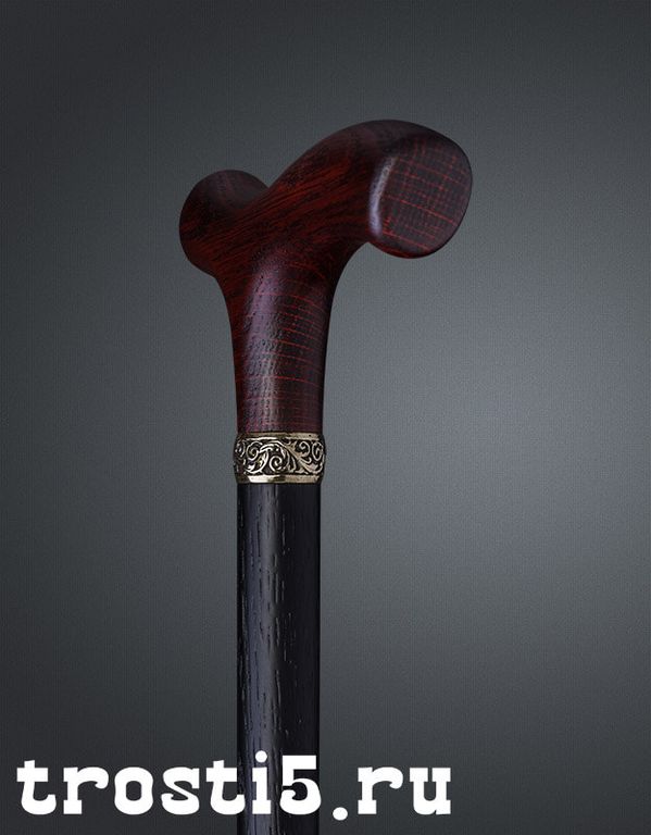 Трость цвета махагон - это стильный и функциональный аксессуар, который подойдет для каждого. Форма рукояти выполнена в классическом стиле, обеспечивая удобство и комфорт при использовании. Вы можете выбрать соединительное кольцо из латуни, которое может быть золотистого цвета или серебристого с никелированием. Кольцо украшено уникальным авторским орнаментом, добавляющим изысканности вашей трости.