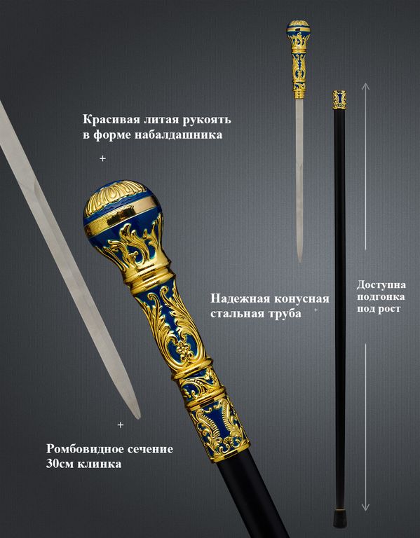 Клинок трости выполнен из нержавеющей стали, что делает его прочным и устойчивым к коррозии. Клинок имеет длину 30 см и не имеет колюще-режущих кромок. Кончик клинка имеет скругленную форму, поэтому данная трость не является "холодным оружием".