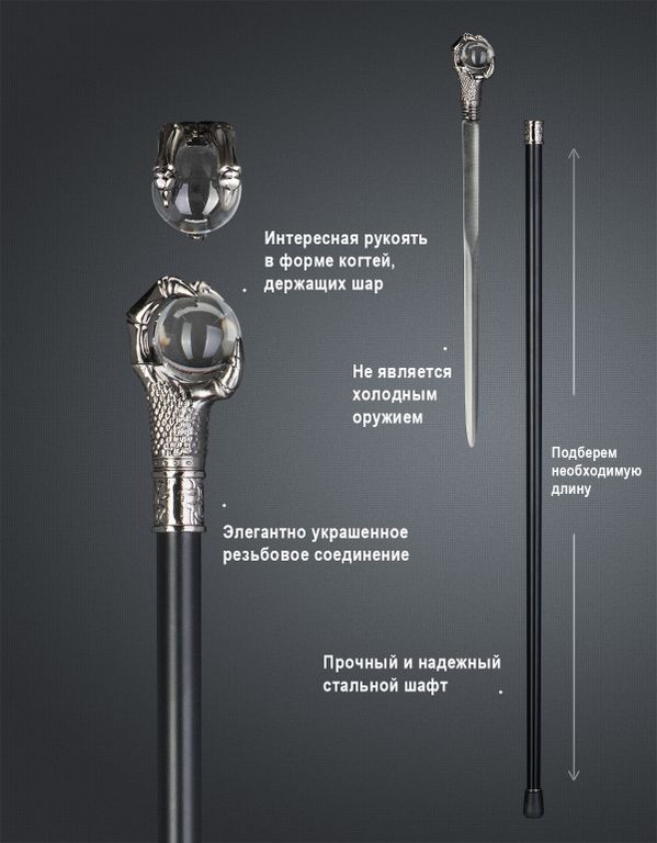 Аксессуарная трость "Шар Власти" - это уникальный и стильный предмет, который подойдет как для коллекционеров, так и для любителей фэнтези. Будьте оригинальны и добавьте немного магии в свою жизнь с этой прекрасной тростью с клинком внутри. Закажите сейчас и подарите себе или близкому человеку незабываемый подарок!