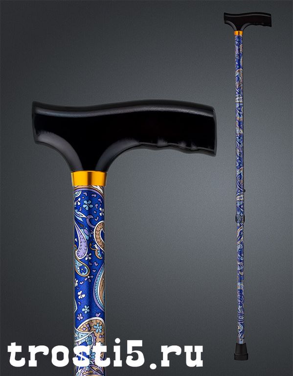 Шафт трости выполнен из авиационного алюминия, что делает ее легкой и прочной. Он имеет привлекательный синий цвет с узорами, добавляющими оригинальности и элегантности. Рукоятка имеет черный цвет с легким бордовым оттенком, создавая гармоничное сочетание с цветом шафта.