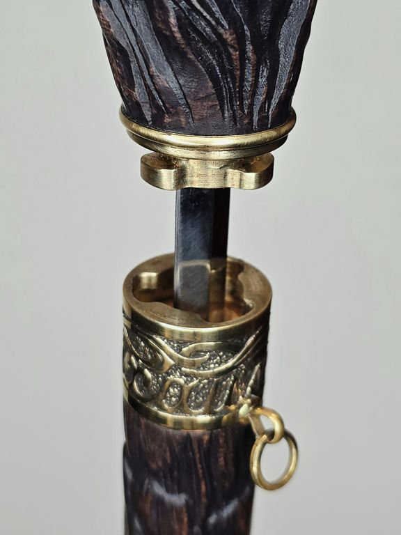 Соединительное кольцо трости выполнено из латуни, что добавляет ей прочности и эстетического шарма. Наконечник трости также выполнен из латуни и имеет шип, который обеспечивает лучшую устойчивость на различных поверхностях.
