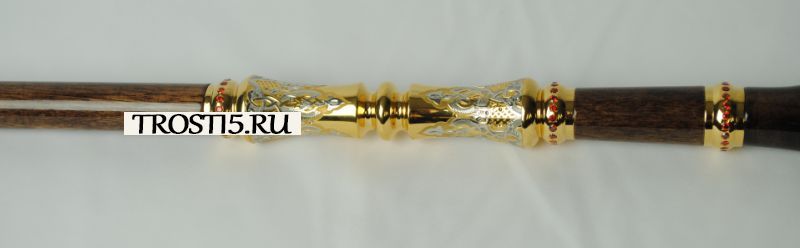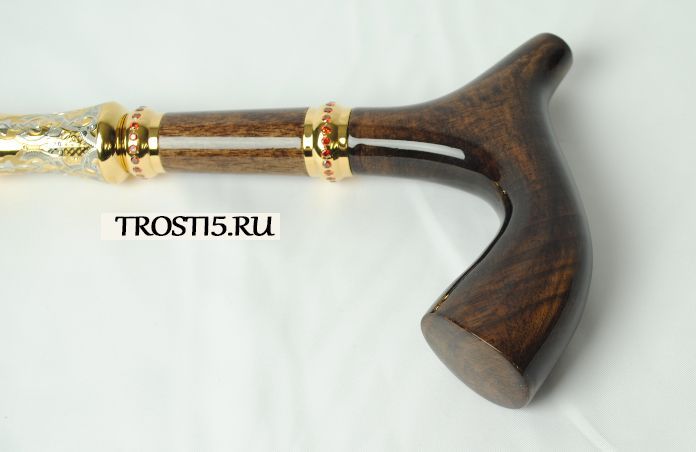 Форма рукояти классическая, что придает трости элегантный и величественный вид. Рукоять изготовлена из американского ореха и латуни, что придает ей прочность, надежность и изысканность. Вставки и соединительное кольцо выполнены из латуни, золота, никеля и фианита, добавляя дополнительный шарм и блеск.